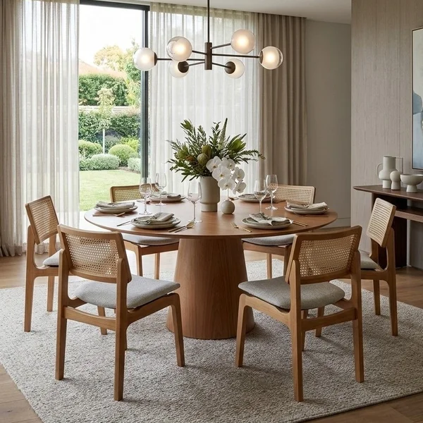 Transforme suas refeições em momentos memoráveis com a Mesa de Jantar Remi. Com um design circular de 150 cm de diâmetro, ela é a peça central perfeita para quem busca unir o aconchego da madeira com um visual contemporâneo e fluido.